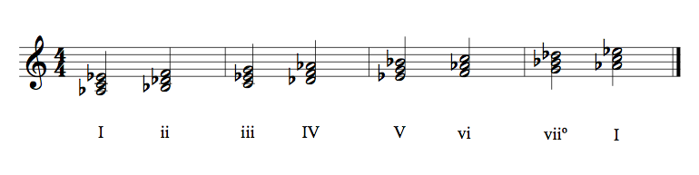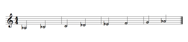 The following scale is Ab Major and contains 4 flatted notes. They are Bb, Eb, Ab, and Db.
