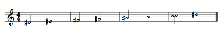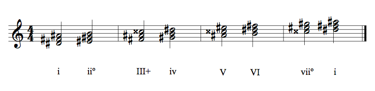 The key of D# minor derives it’s key signature from the relative major of F#. Additionally there is the raised 7th scale degree. The D# minor scale is shown below.