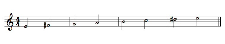 The key of E minor is the relative of G major and contains the “F#” accordingly. However, because the Harmonic minor scale can be thought of as altered, it actually contains two sharps. The other is D#. Below, the E Harmonic minor scale is pictured.